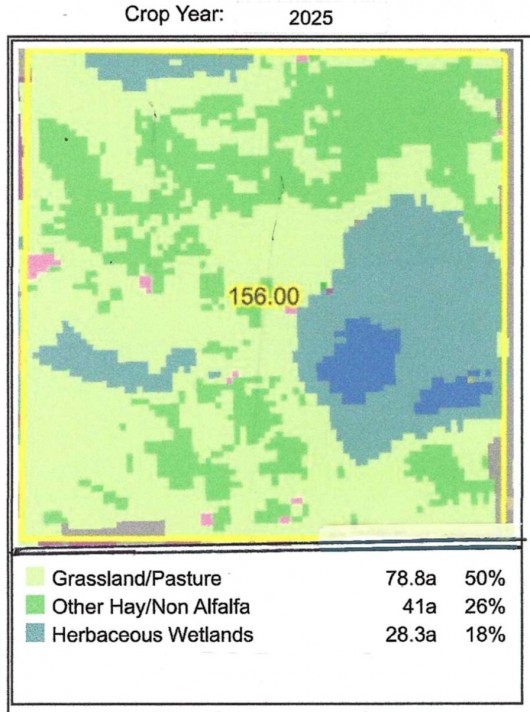 120.7 Acres of Cropland planted to Grass/Hay. Balance in Wetland.