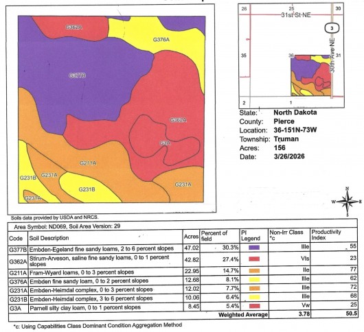 Excellent Access on this 156 Acre Quarter along Hwy. 3 just 5 Mi North of Harvey, ND and less than 1/2 Mi from the infamous Goose Lake. 120.7 Acres of Class II & III Soils Cropland w/58 Productivity Index average currently Planted to Grass/Hay for Livestock Feed. There are NO Ag Leases and NO USFW Easements on this Land. The proximity to Goose Lake is an Added Bonus! Seller's Asking $468,000 or $3,000/ac avg.