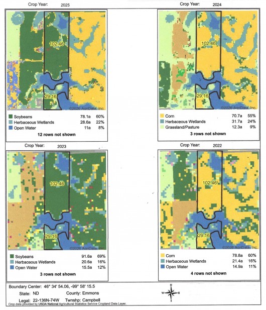 130 +/- Acres of NHEL (Non-Highly Erodible) Cropland according to FSA Map and 30 +/- Acres of Trees and Wetlands. However, water levels change on this parcel, and Planted Cropland Acres vary from 70 to 91 Acres in recent past years.