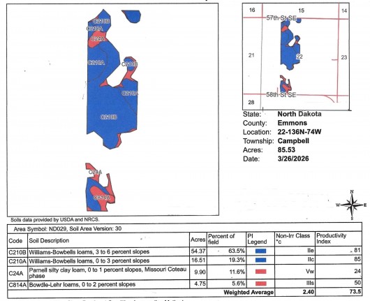 This Absolutely Beautiful w/Good Return on 160 +/- Acre Parcel of the Kuipers Family Farm offers a wonderful Building Site Location for a Hobby Farm or Campsite to be Developed. It is located in NE Emmons County just 1-1/2 Mi N of Kintyre, ND and straight S of Steele, ND that is next to I-94 in the Heart of the Prairie Pothole Region & Migration Flyway. This long Quarter of Land offers 159.44 +/- Acres with alternating Hi-Yields of Corn & Soybeans on Tillable Acres from Rich NHEL Class II Soils sporting a 72.4 Productivity Index and the Balance in Mature Trees and scenic Wetlands. Easy Access on the South side w/Utilities & Rural Water Available in the area and Prairie Trail Access on the North side. 130 Acres of FSA Cropland is Leased for '26 Season at $90/Tillable Ac or $11,700/yr. to a Good Renter interested in continuing to Lease. Make some Lasting Memories with this Fertile Cropland, Wetlands & Abundant Wildlife & Waterfowl creating outstanding opportunities for Outdoor Recreation. Please enjoy a DRONE VIDEO of this Land. REDUCED to Asking $340,000 or $2,125/ac avg.