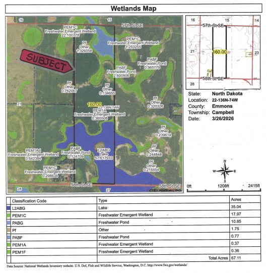 Easements: There is NO USFW Grassland Easement on this Property, however there IS a perpetual USFW Wetland Easement that does not interere with Farming, Building or Hunting, but does restrict draining, filling, leveling or burning of Wetlands without permission.