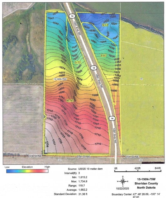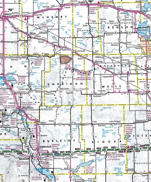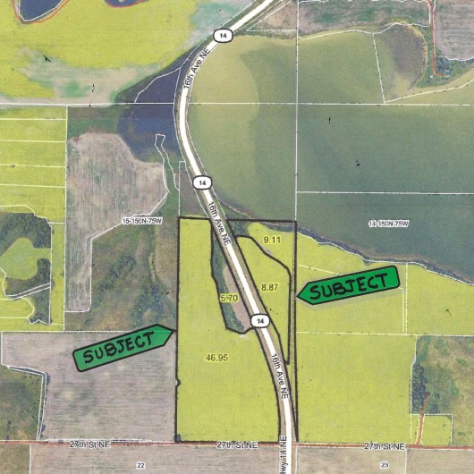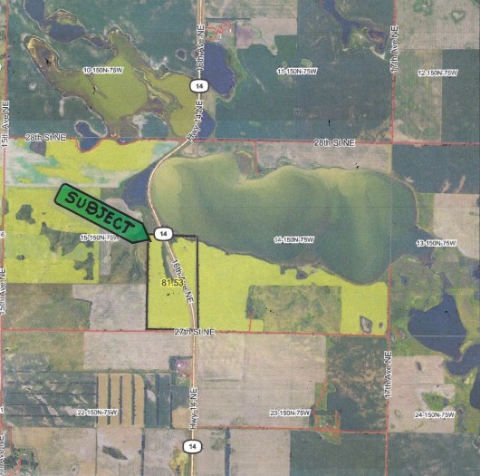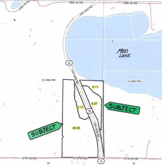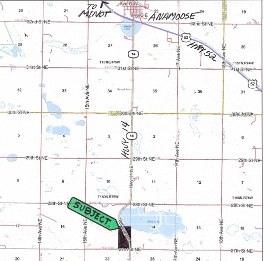 Location: From Anamoose, ND at the Junction of Hwy. 52 and Hwy. 14, travel South on Hwy. 14 just 5 miles to 27th Street NE to the SE corner of the Land. The Subject Land is on both sides of Hwy. 14 (See Plat Map).