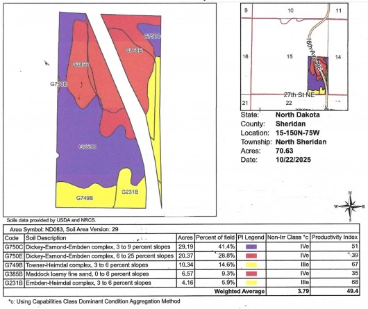 This North Sheridan 70.63 Acres blends Productive Cropland, Recreation and Natural Beauty. With Trees and Mud Lake Shoreline, it is ideally located along Highway 14 just South of Anamoose, ND and Hwy. 52. Ready to Plant for 2026 Season, or a good Renter available. Seller Asking $196,000 or $2,775/ac avg.