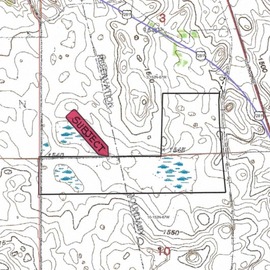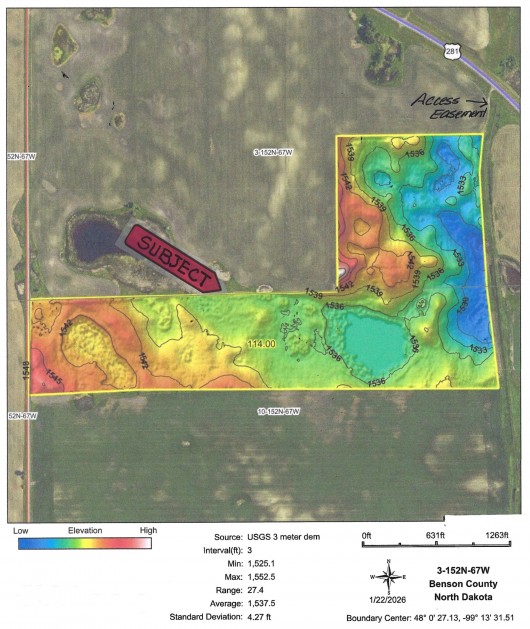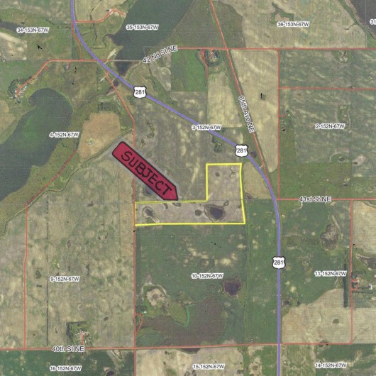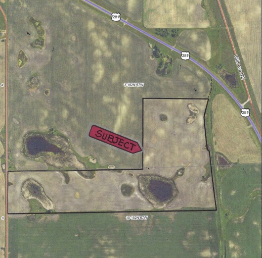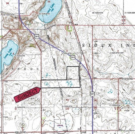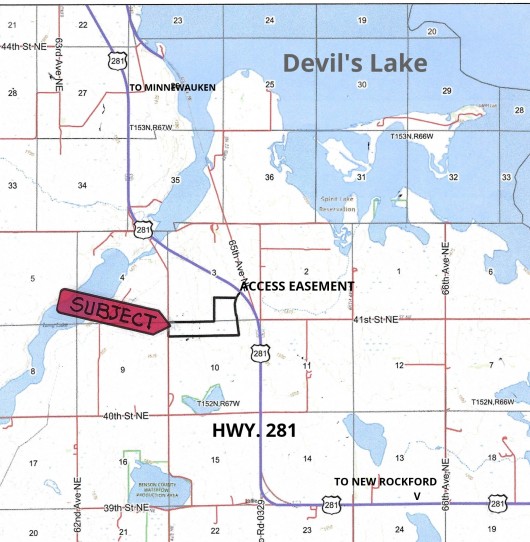 Location: From Minnewauken, ND travel South on Hwy. 281 for 4 Miles to the NE corner of the Subject Land (See Map). There is a recorded Access Easement for Landowner to Access Property off Hwy. 281.