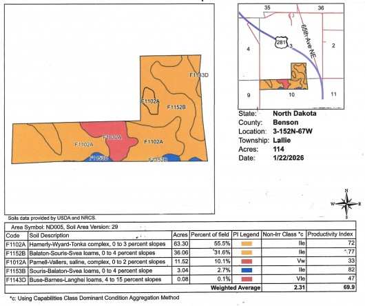 Legal Description: SW1/4 SE1/4 (Less 5.75 Ac) Section 3, N 873' of Lot 4 and N 873.83' of Lot 1 & N 873.83' of NW1/4 NE1/4 Lying W of RR RW in Section 10, All in Township 152 North, Range 67 West according to the Benson County Treasurer Tax Statement consisting of 113.87 Acres in Benson County, North Dakota with Sellers reserving Oil & Gas Rights currently owned, if any.
